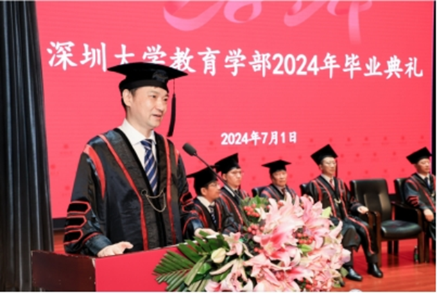 在致辞中,靳玉乐对即将启程的毕业生们表示最热烈的祝贺和最衷心的祝福,用《努力做守纪律的时代新人》给毕业生们上了毕业前的“最后一课”。他说,“欲知平直,则必准绳;欲知方圆,则必规矩。”人若有了规矩,能够做到守纪律,就能弄清楚该做什么、不该做什么,能做什么、不能做什么。深大校训中有“自律”的要求,一个人要有所成就,不能完全靠外部约束,要靠自觉自律。只有把遵规守纪刻印在心,内化为言行准则,进而形成遵规守纪的高度自觉,才能成为有理想、有本领、有担当的时代新人。最后,他嘱托每一位毕业生,要“把学习作为首要任务,作为一种责任、一种精神追求、一种生活方式,树立梦想从学习开始、事业靠本领成就的观念”,努力做守纪律的时代新人。